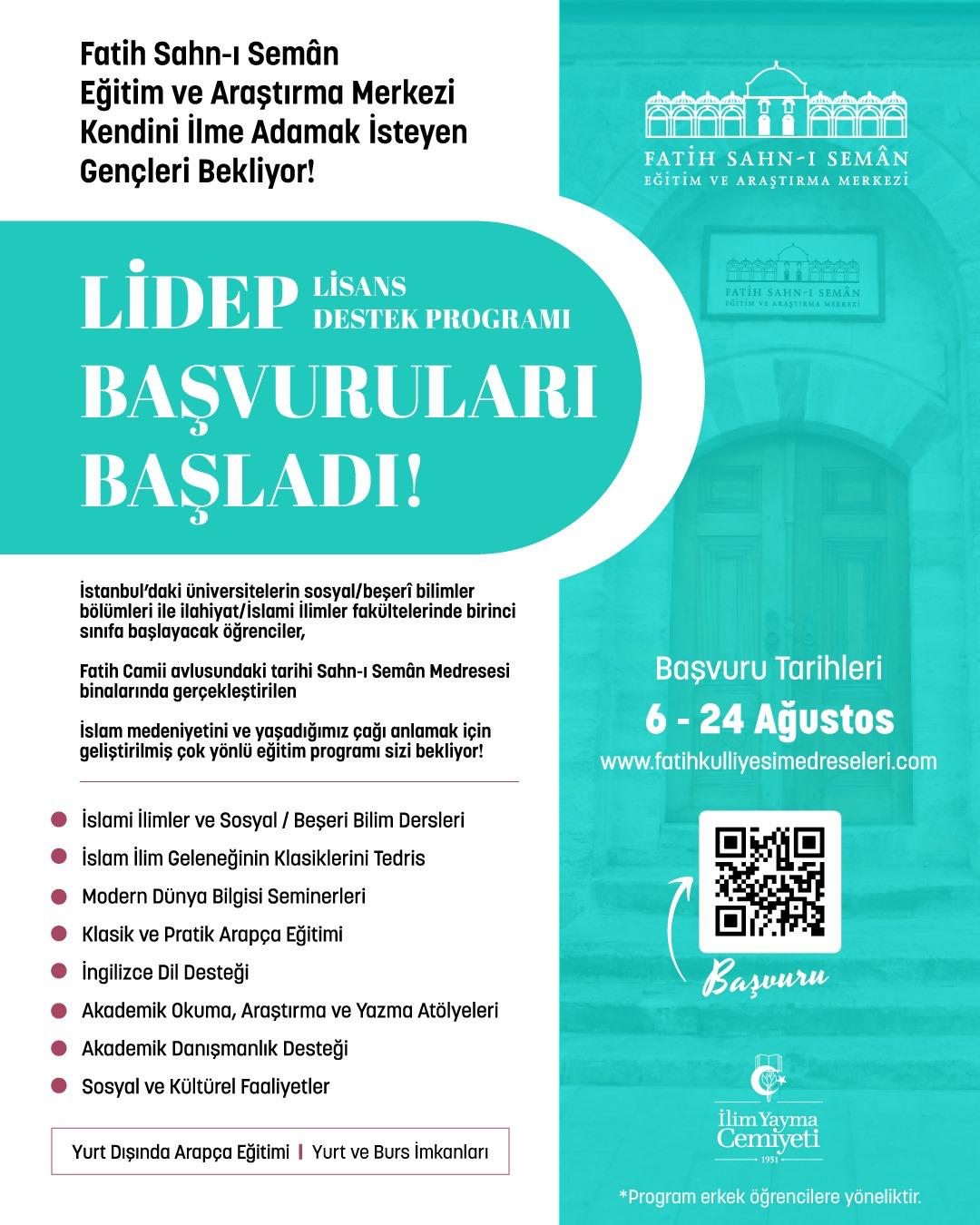 Fatih Sahn-ı Semân Eğitim ve Araştırma Merkezi tarafından düzenlenen Lisans Destek Programı (LİDEP) için 2025-2026 dönemi başvuruları başladı. Program, İstanbul’daki üniversitelerin sosyal ve beşeri bilimler bölümleri ile ilahiyat/İslami ilimler fakültelerinde öğrenim gören lisans öğrencilerine hitap ediyor.